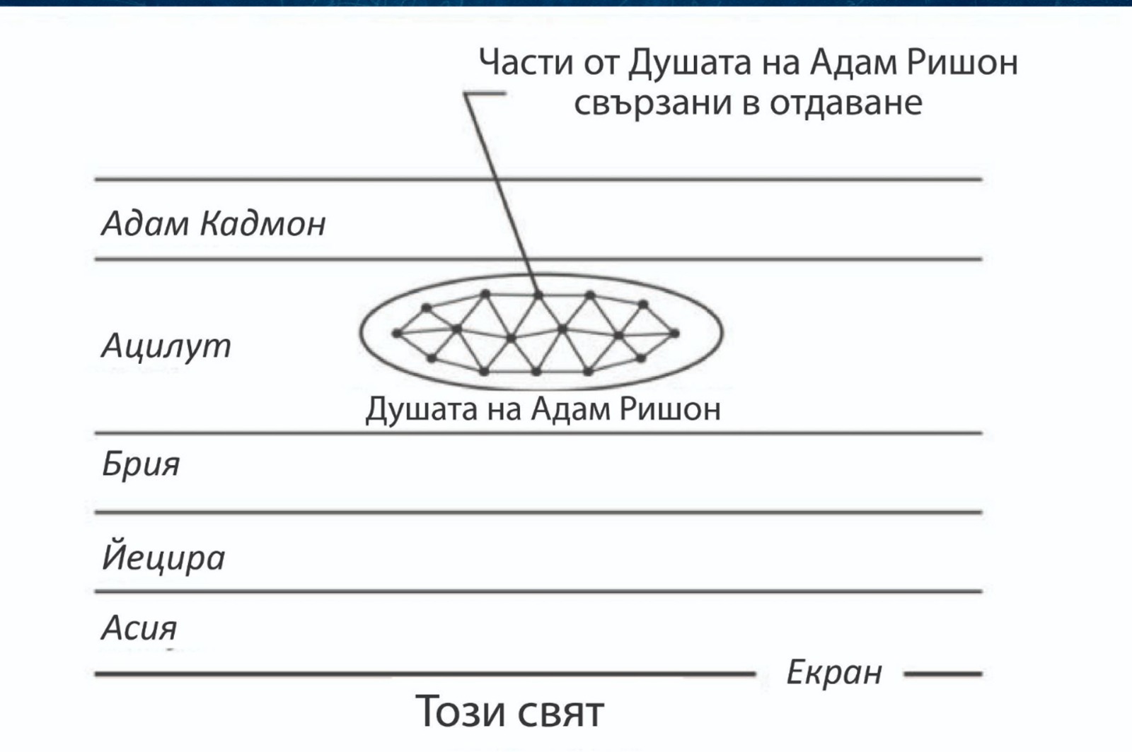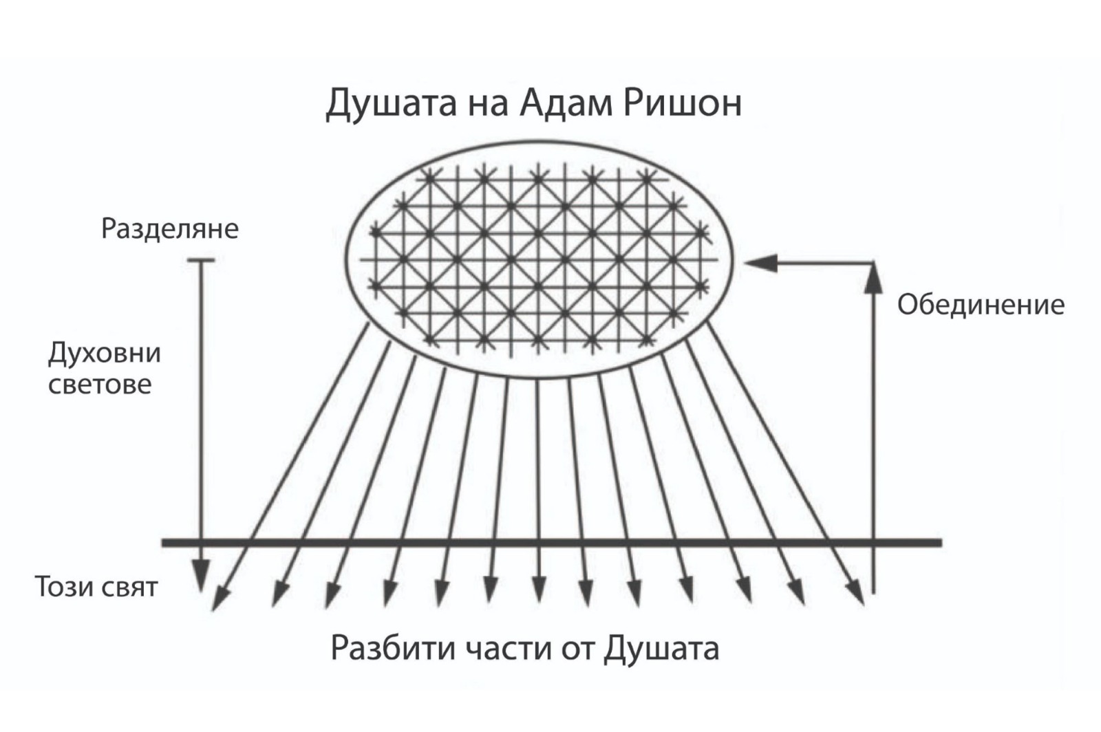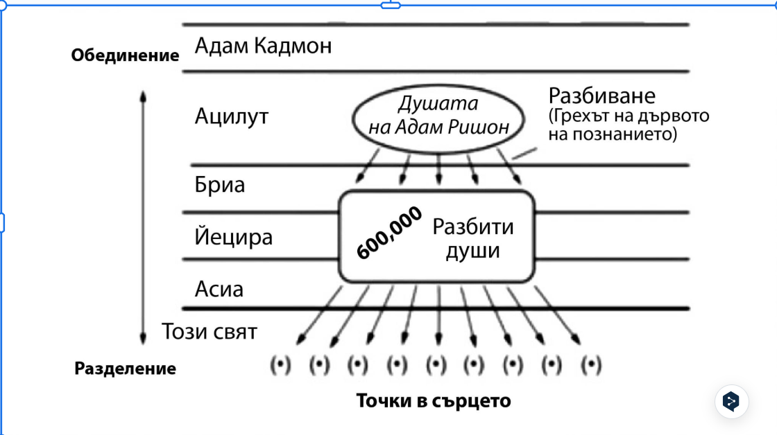 ... трябва да знаете, че всички души произлизат от душата на Адам Ришон, защото, след като той е извършил греха на Дървото на Познанието, душата му се е разделила на 600 000 души, тоест това, което е било за Адам Ришон една светлина, наречена на езика на книгата Зоар “висше сияние”, което е било в Райската градина едновременно, се разделя на много части.