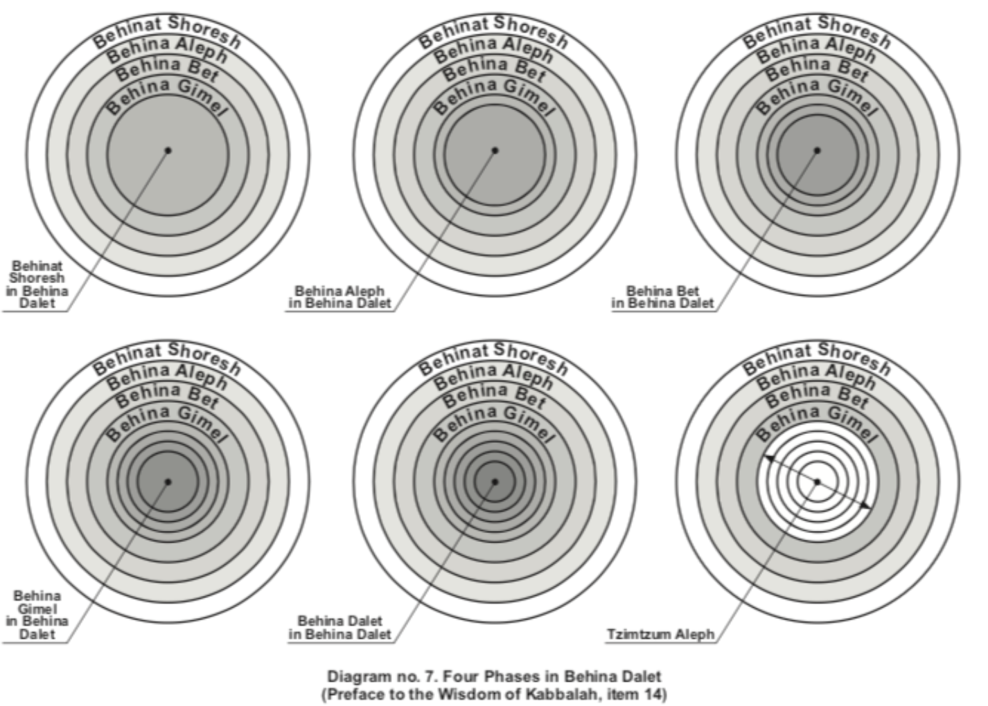 И така, разпространението на светлината, а след това нейното изгонване създава съсъда. Получава се, че ако сега съсъдът отново приеме светлина, той ще бъде първичен по отношение на нея, ще предшества светлината. Затова бхина далет се явява окончателния стадий на създаването на съсъда, който се нарича „малхут” (царство).