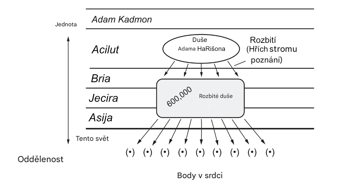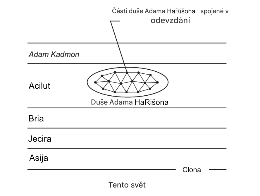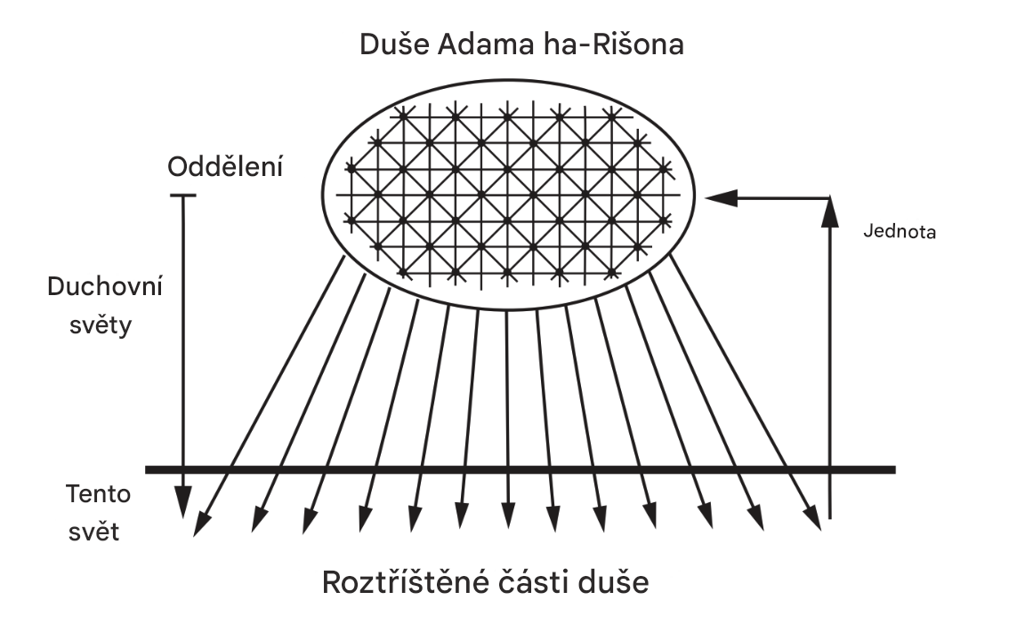 „Zde by mělo být známo, že všechny duše pocházejí z jedné duše, Adama Rišona. Poté, co spáchal hřích Stromu poznání, byla jeho duše rozdělena na šest set tisíc duší. Jinými slovy, to, co bylo pro Adama Rišona jedno světlo, nazývané v jazyce Knihy Zohar „Vyšší září“, které měl v tuto dobu v zahradě Eden, je rozděleno do mnoha částí.“