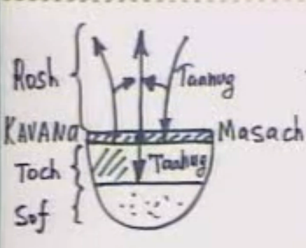 Das leere Kli teilt sich nach dem ersten Zimzum nun in zwei Teile: einen Platz, an dem es möglich ist, Genuss zu empfangen, und einen Platz, an dem es unmöglich ist, Genuss zu empfangen. Der Platz im Kli, an dem die Berechnung stattfindet, wird „Rosh“ genannt. Der Platz, an dem der Genuss empfangen wird, wird „Toch“ genannt, und der Platz, der aufgrund des Mangels an Massach leer von Licht bleibt, wird „Sof“ genannt. Das eine allgemeine Kli ist deshalb in drei Teile geteilt: Rosh, Toch, Sof. Über dieses Kli lehrt uns die Weisheit der Kabbala; dieses Kli wird das Geschöpf genannt.