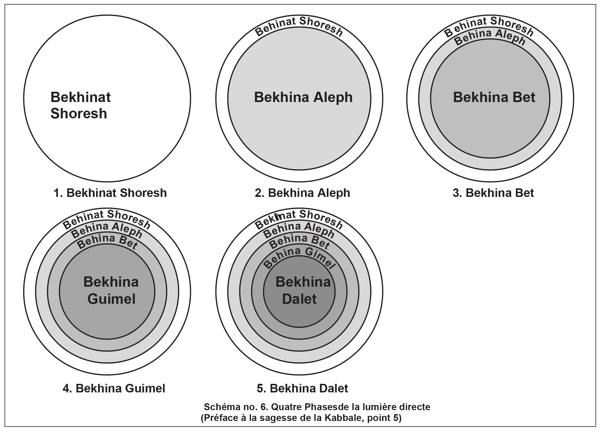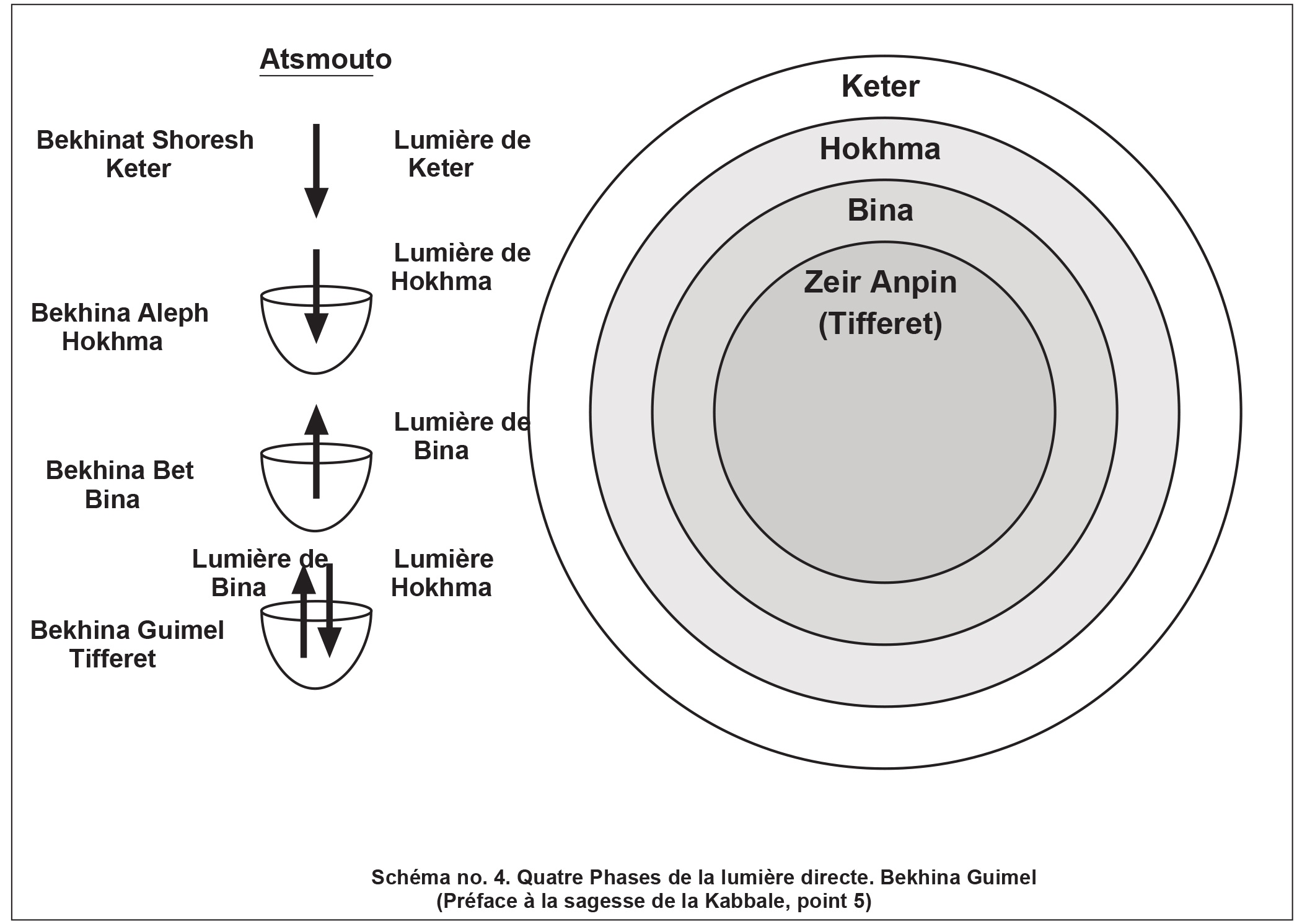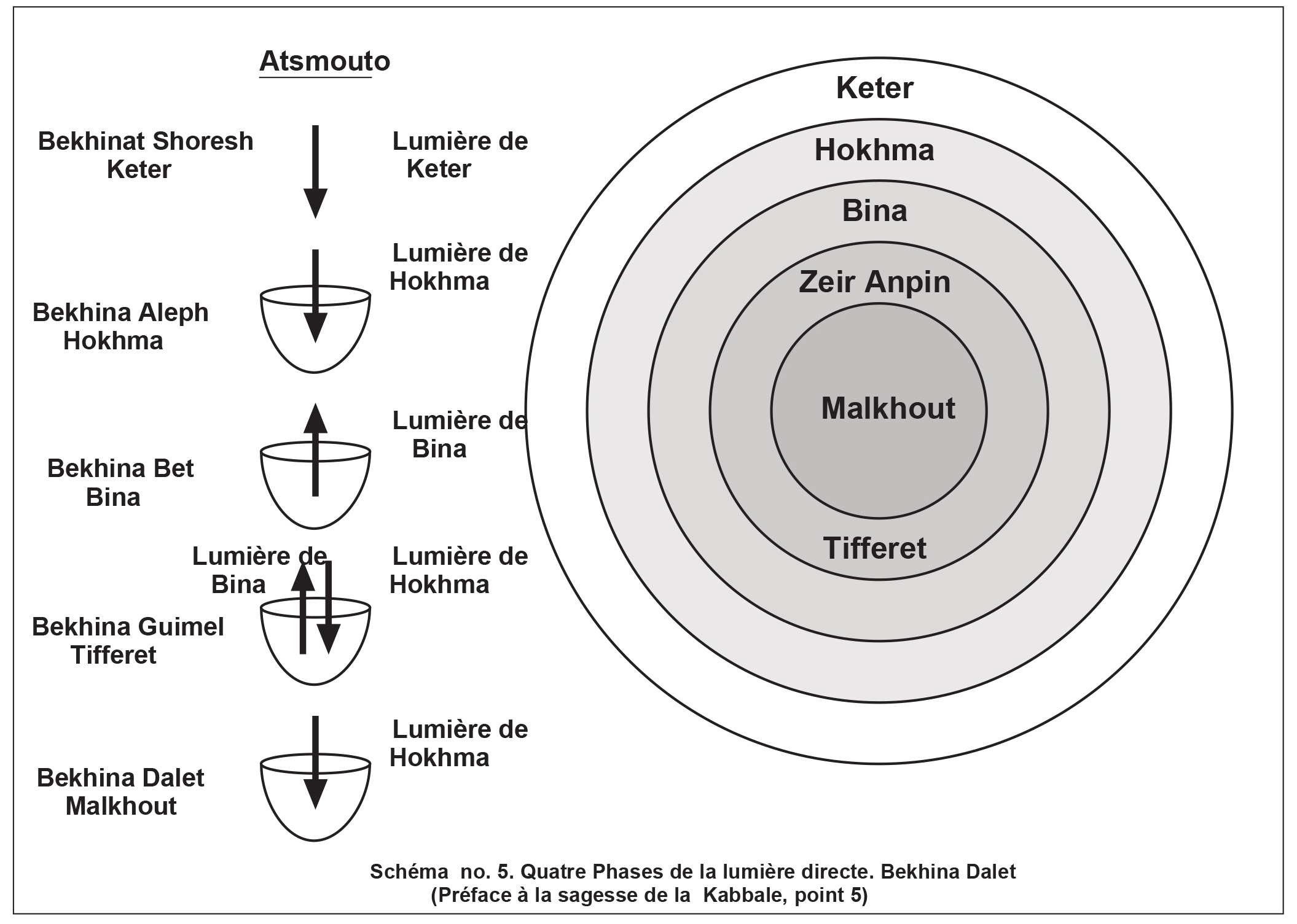 5) C'est pourquoi les quatre phases du nom HaVaYaH, appelées Hokhma, Bina, Tifferet, Malkhout, sont nécessaires. La première phase, appelée Hokhma, est en fait l'ensemble de l'être émané, la lumière et le récipient. En elle se trouve le grand désir de recevoir avec toute la lumière qui y est incluse, appelée « lumière de Hokhma » ou « lumière de Haya », car c'est toute la lumière de Hayim [la vie] dans l'être émané, habillé dans son récipient. Cependant, cette phase un est considérée comme toute lumière, et le récipient en elle est à peine perceptible car il est mêlé à la lumière et annulé en elle comme une bougie dans une torche
