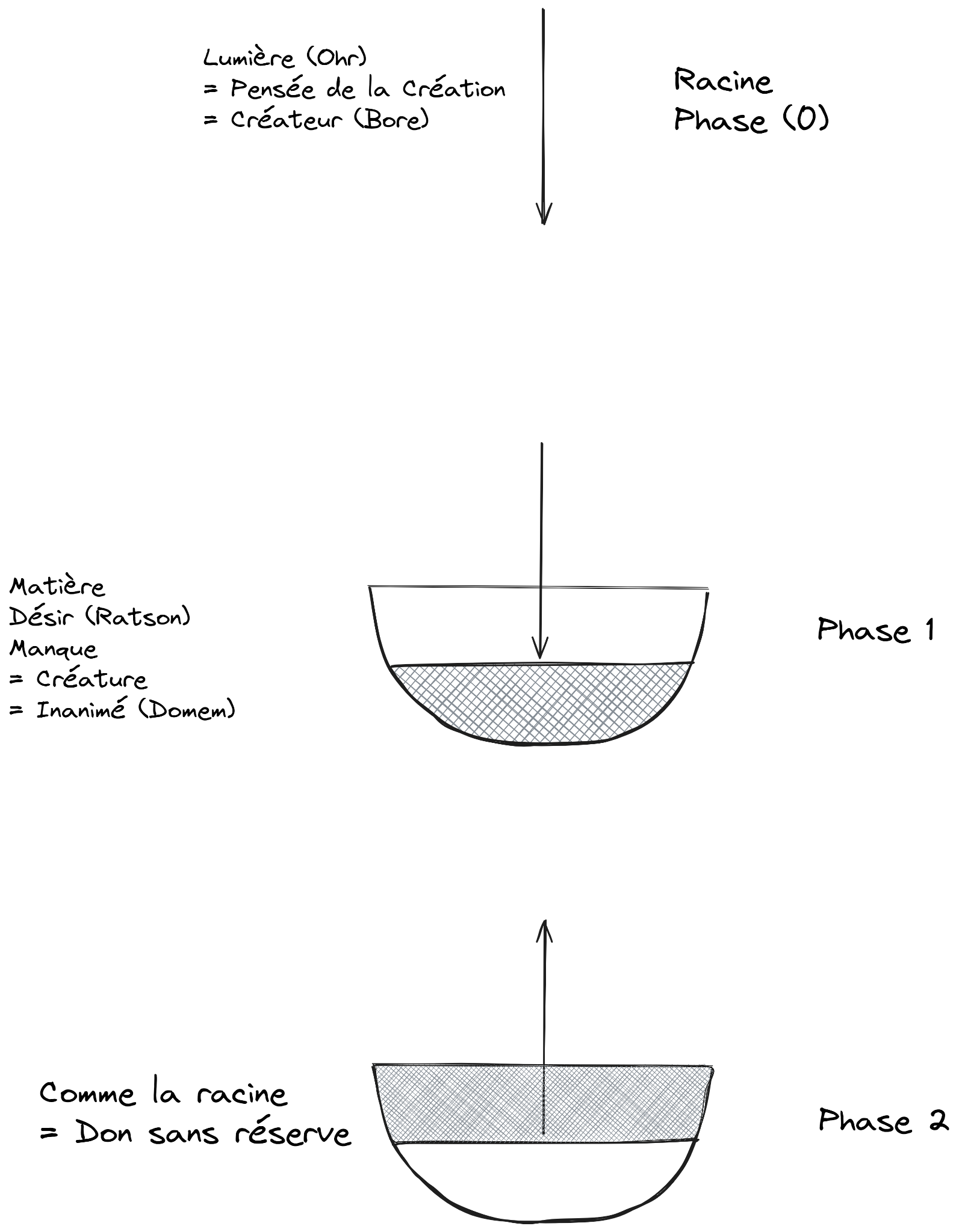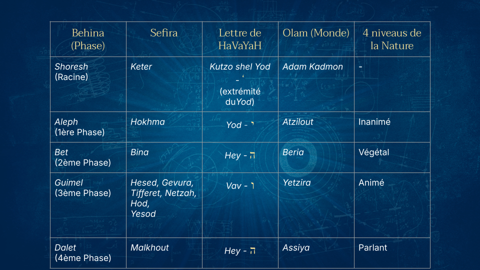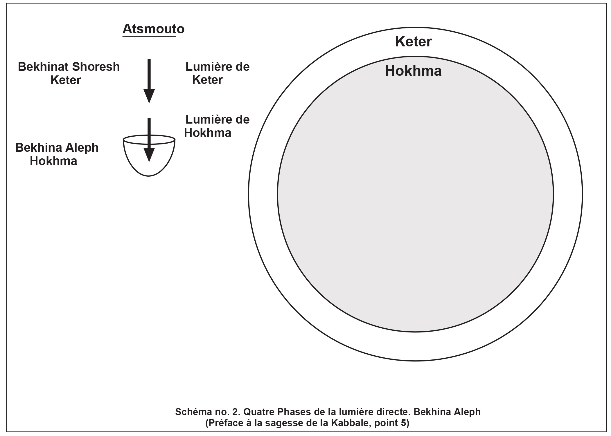 5) C'est pourquoi les quatre phases du nom HaVaYaH, appelées Hokhma, Bina, Tifferet, Malkhout, sont nécessaires. La première phase, appelée Hokhma, est en fait l'ensemble de l'être émané, la lumière et le récipient. En elle se trouve le grand désir de recevoir avec toute la lumière qui y est incluse, appelée « lumière de Hokhma » ou « lumière de Haya », car c'est toute la lumière de Hayim [la vie] dans l'être émané, habillé dans son récipient. Cependant, cette phase un est considérée comme toute lumière, et le récipient en elle est à peine perceptible car il est mêlé à la lumière et annulé en elle comme une bougie dans une torche