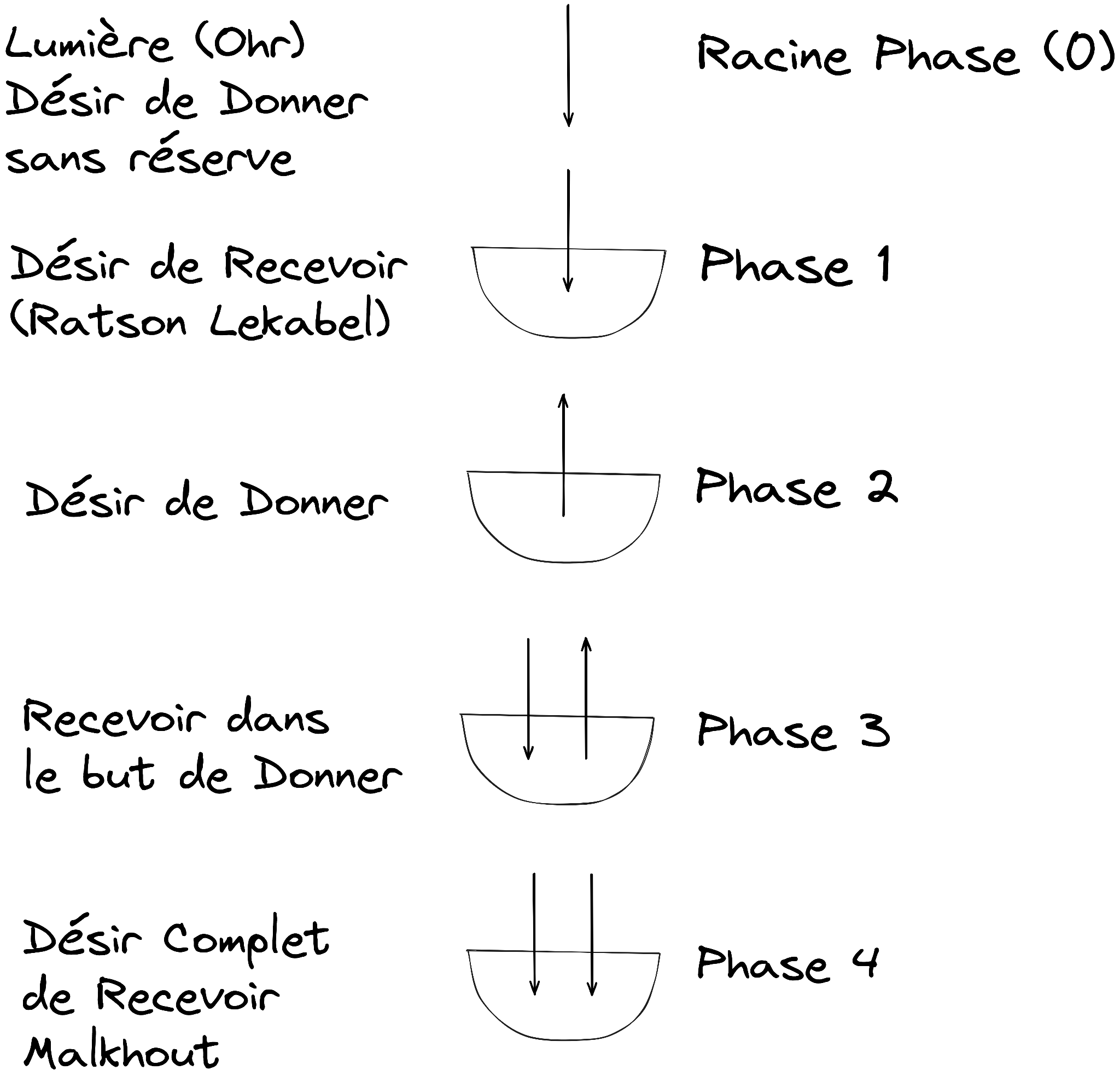 Vient ensuite la phase quatre, puisque le récipient de la phase trois s'est également éveillé à sa fin pour attirer la lumière complète de Hokhma, comme c'était le cas dans la phase un. Ainsi, Cet éveil est donc considéré comme une « envie » dans la mesure du désir de recevoir de la phase un et la dépasse, car il est déjà séparé de cette lumière, puisque la lumière de Hokhma ne l'habille plus, mais le désire. Ainsi, la forme du désir de recevoir a été entièrement définie, puisque le récipient est déterminé après l'expansion de la lumière et son départ de là. Plus tard, à son retour, il recevra à nouveau la lumière. Il s’avère que le récipient précède la lumière, et c’est pourquoi cette phase quatre est considérée comme l’achèvement du récipient, et elle est appelée Malkhout [Royauté]. »