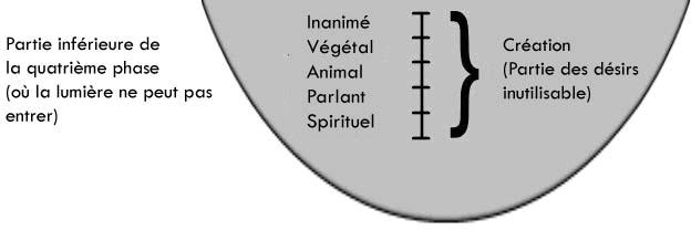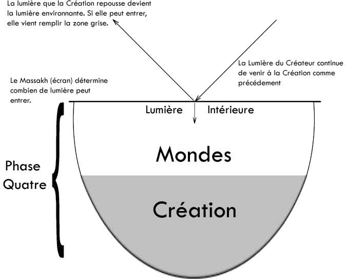 Les désirs utilisables de la Phase Un ont créé le monde d’Atsilout et les inutilisables sont restés dans l’obscurité et constituent le niveau « végétal » de la Création. Les désirs utilisables de la Phase Deux ont créé le monde de Briya et les inutilisables constituent le niveau « animal » de la Création. Les désirs utilisables de la Phase Trois ont créé le monde de Yetsirat et les inutilisables constituent le niveau « être parlant » de la Création. Pour finir, Les désirs utilisables de la Phase Quatre ont créé le monde d’Assiya et les inutilisables sont restés dans l’obscurité et constituent le niveau « spirituel » de la Création.