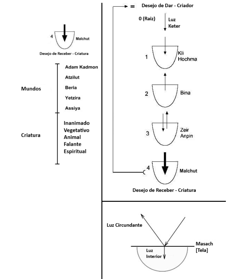 Figura 4: O lado esquerdo do desenho foca-se na estrutura interna de Malchut, mostrando que é a fonte de todos os mundos espirituais, bem como do mundo corpóreo.