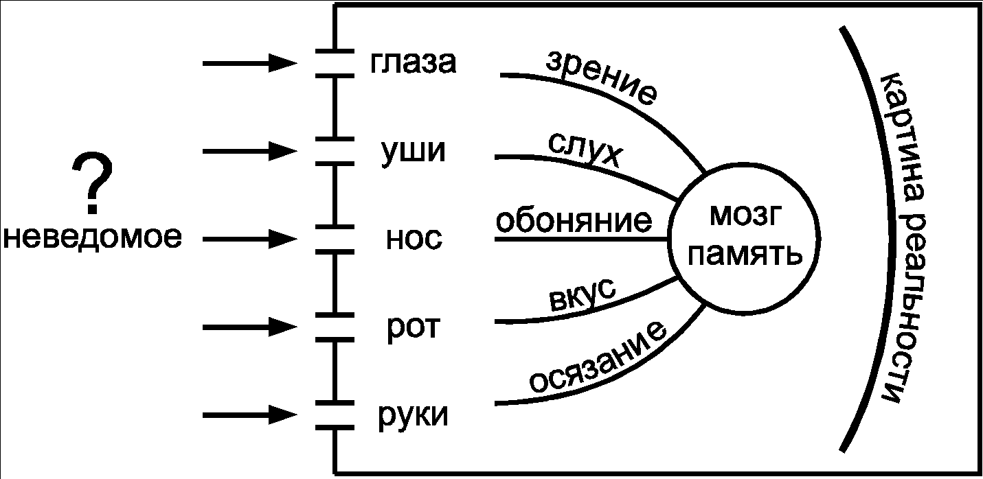 Чтобы проиллюстрировать это, представим себе человека в виде закрытого ящика с пятью отверстиями: глаза, уши, нос, рот и руки (см. схему 1.6). Отверстия соответствуют нашим органам чувств – зрение, слух, обоняние, вкус и осязание. Через них человек воспринимает нечто, что находится вне его.