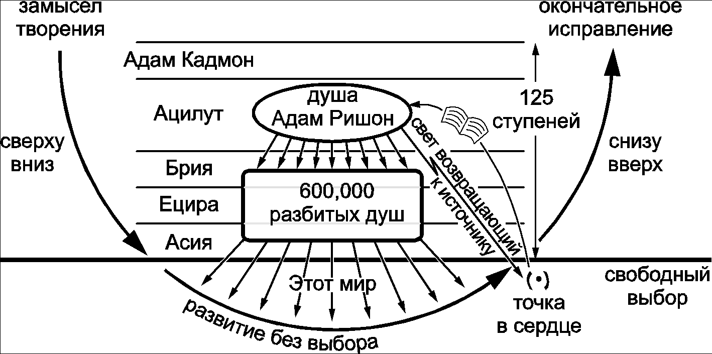 Как сказано, при разбиении души Адам Ришон разорвалась связь отдачи и любви, которая соединяла между собой все части. В результате, пишут каббалисты, душа Адам Ришон разбилась на шестьсот тысяч частей, которые упали из мира Ацилут в миры Брия, Ецира и Асия (см. схему 2.9). Каждая часть разбитой души в духовных мирах также разделяется на несколько еще более мелких осколков, которые упали в наш мир. Эти искорки души и являются точками в сердце, которые пробуждаются в каждом из нас.