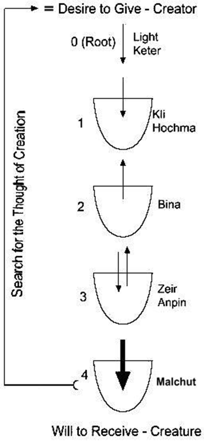 因此,Malchut,即阶段四,与前三个阶段都截然不同,这是由于它想接受一种非常明确的快乐(参看插图2中更粗的箭头)……也就是接受与创造者变得等同所带来的快乐。从创造者的角度来看,Malchut的这种接受的愿望实现并完成了整个创造的思想——也就是最初在他的头脑里构想的创造的循环(图2)。